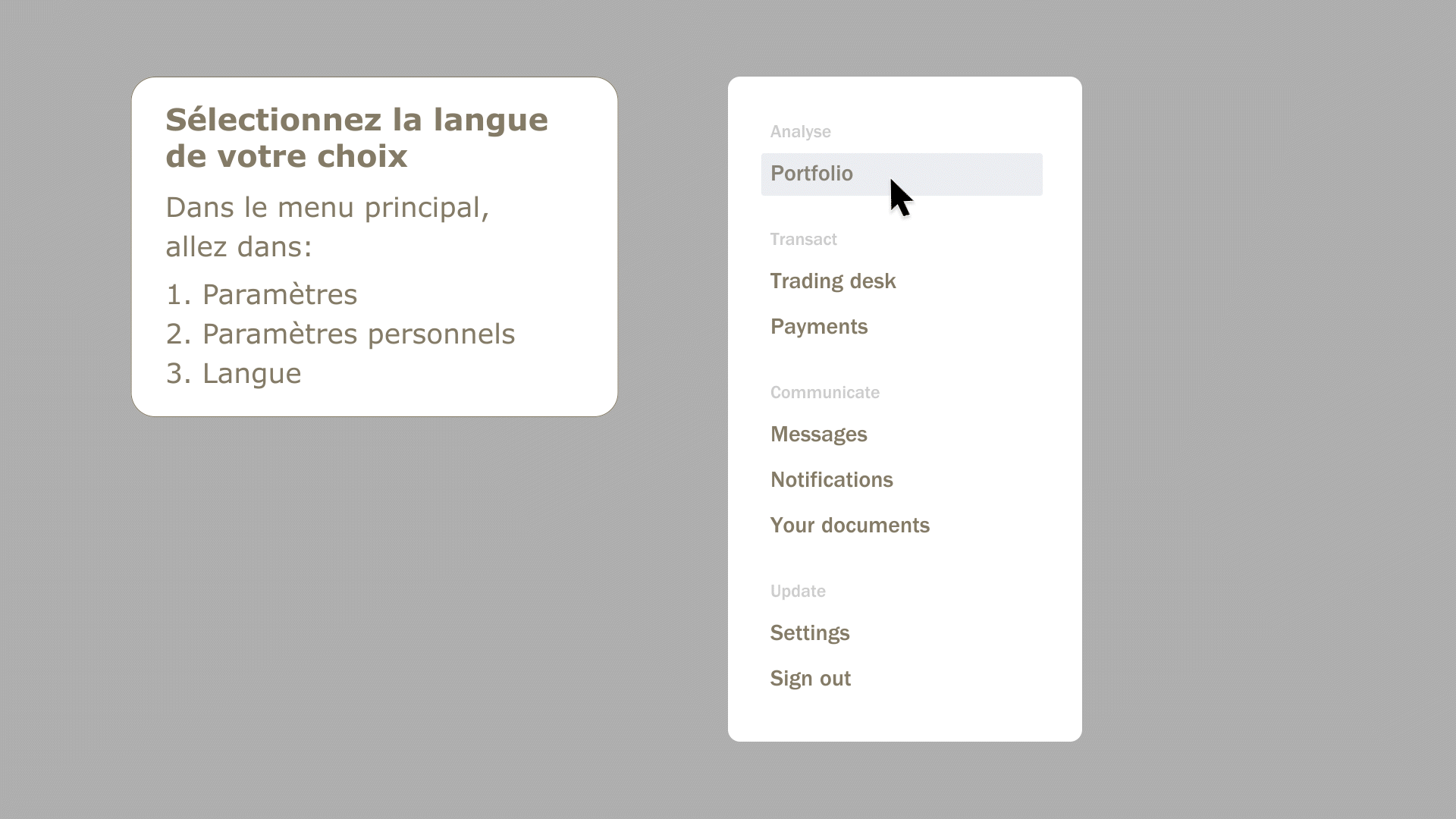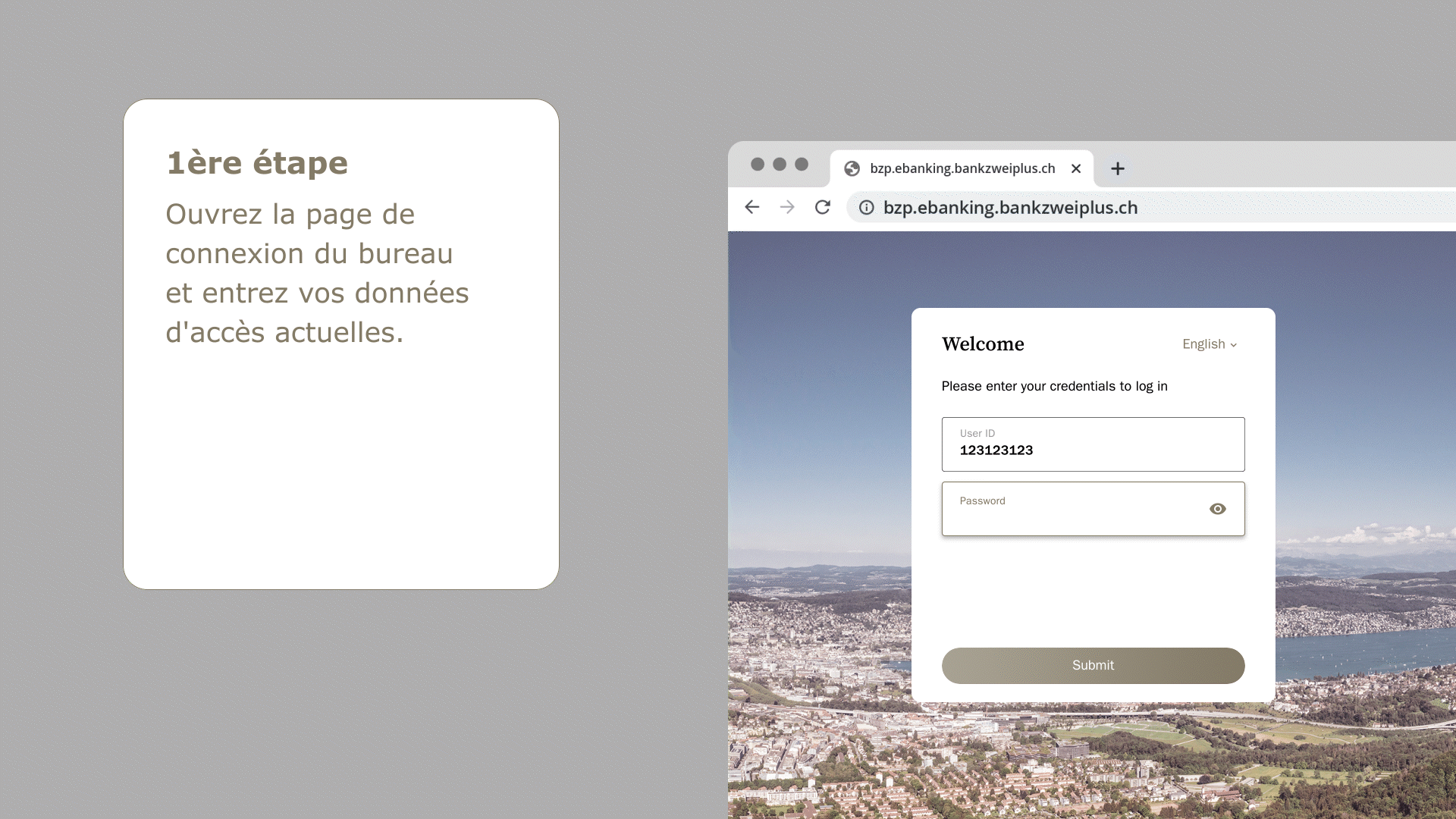 Vous disposez de vos données d'accès (ID utilisateur et mot de passe) et pouvez désormais vous connecter pour la première fois aux nouveaux services bancaires en ligne. Utilisez le SMS ou l'ActivCard comme second facteur. Procédez comme suit pour pouvoir utiliser les services bancaires en ligne: