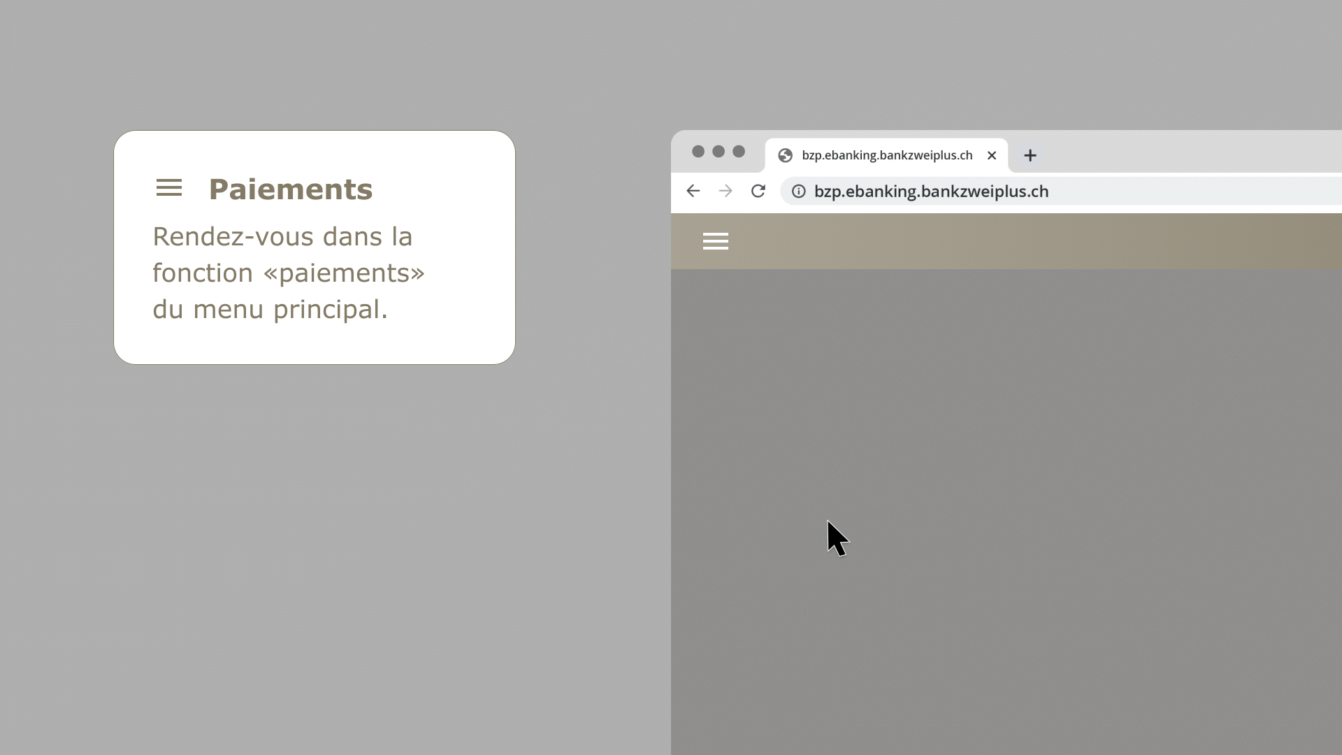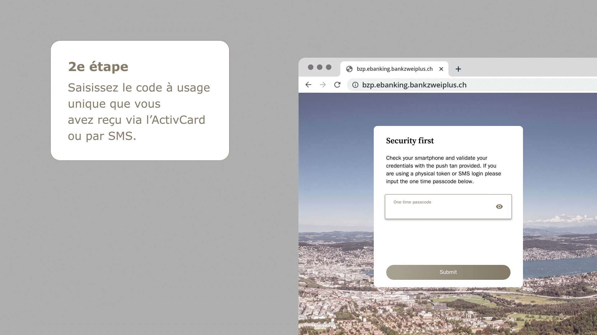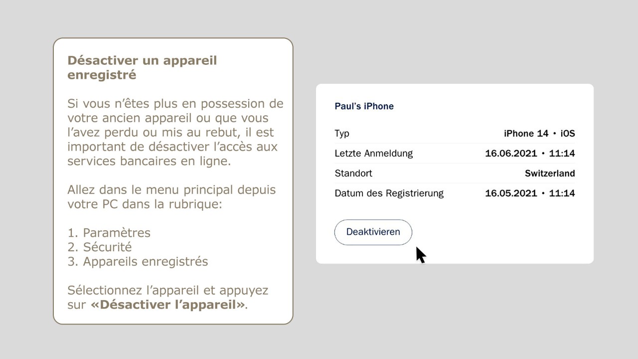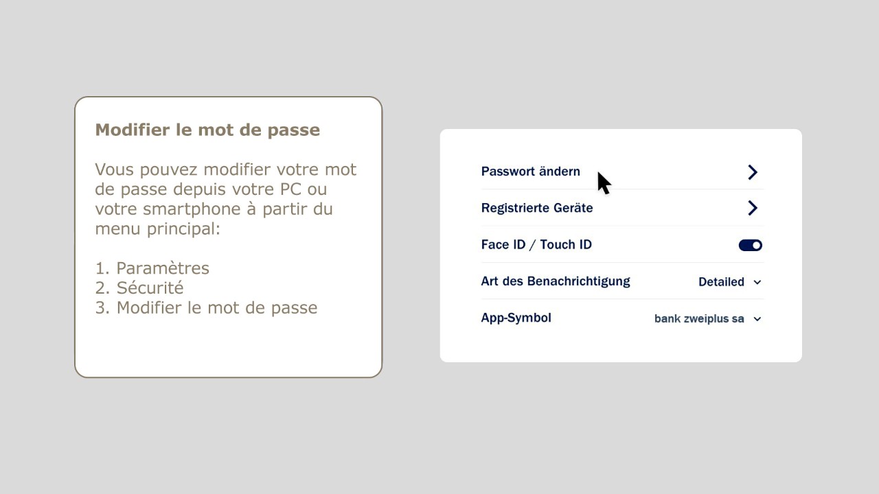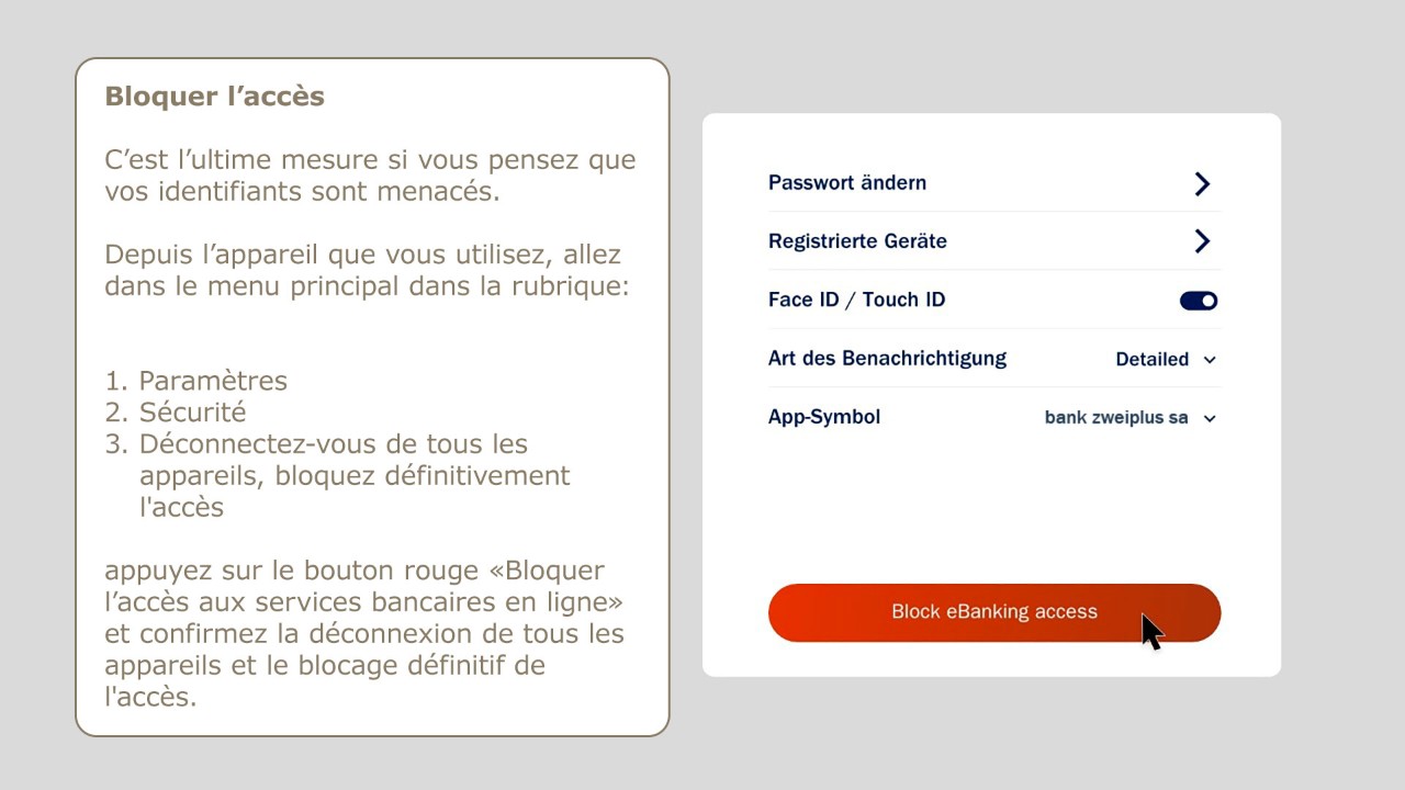 La sécurité est notre priorité. Veuillez suivre nos consignes de sécurité et utiliser les fonctions décrites ci-dessous pour modifier votre mot de passe, désactiver un appareil ou bloquer l’accès à l’application de vos services bancaires en ligne. Vous ne devez jamais communiquer votre mot de passe ou vos données d’accès pour le deuxième facteur à un tiers. Les collaborateurs de la bank zweiplus ne vous demanderont jamais un code SMS, un code ActivCard ou votre mot de passe.