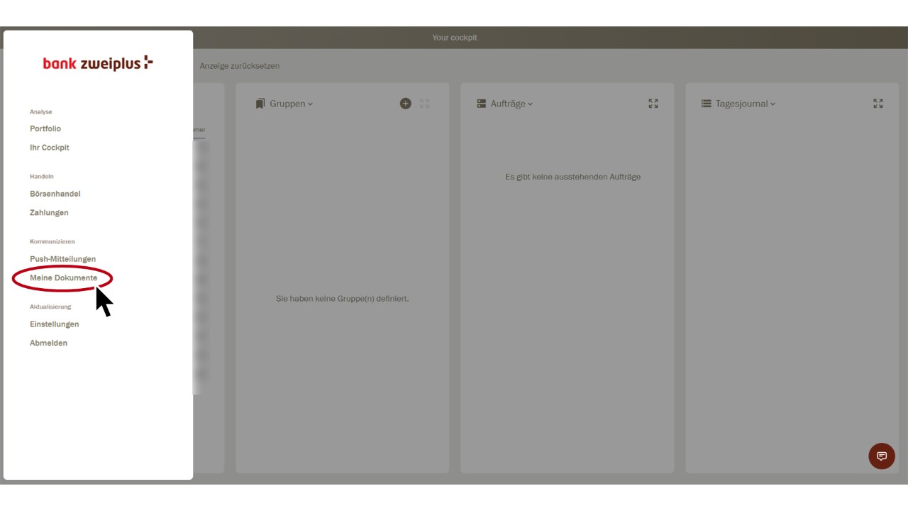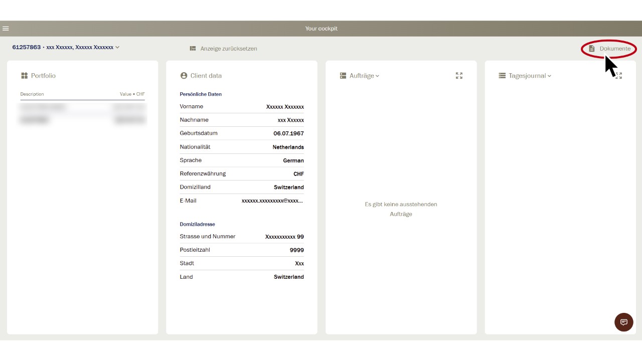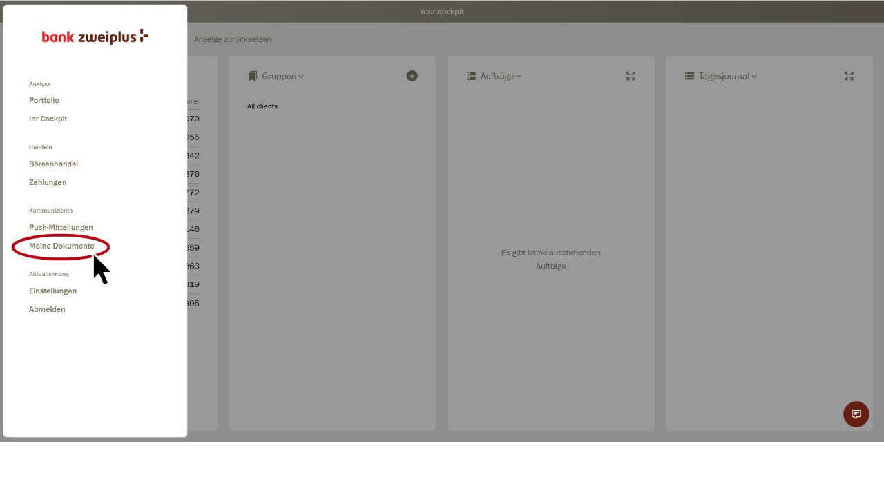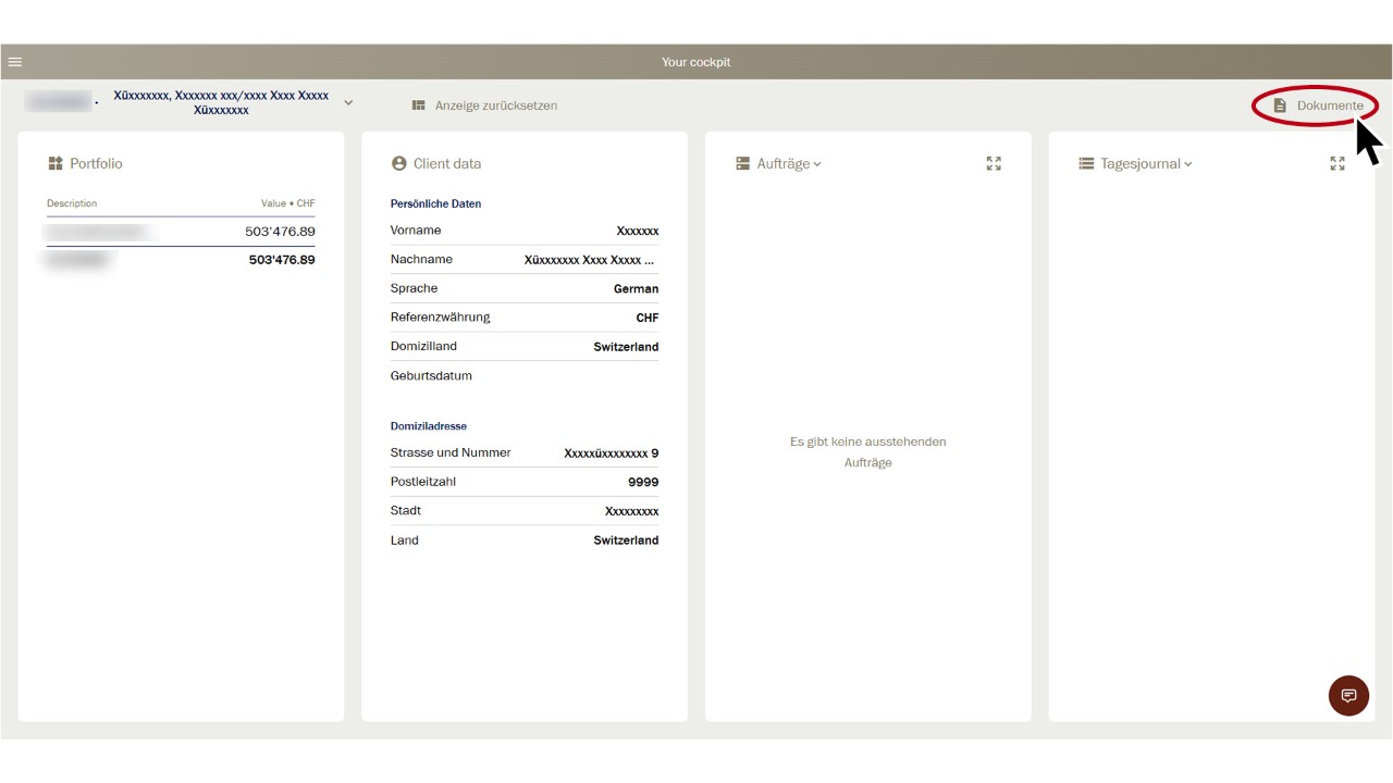 Vous vous trouvez dans le cockpit du client. Sélectionnez «Documents» en haut à droite.