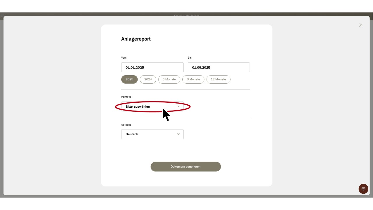 Ensuite, choisissez la période souhaitée ainsi que le client souhaité, resp. le portefeuille client et la langue.